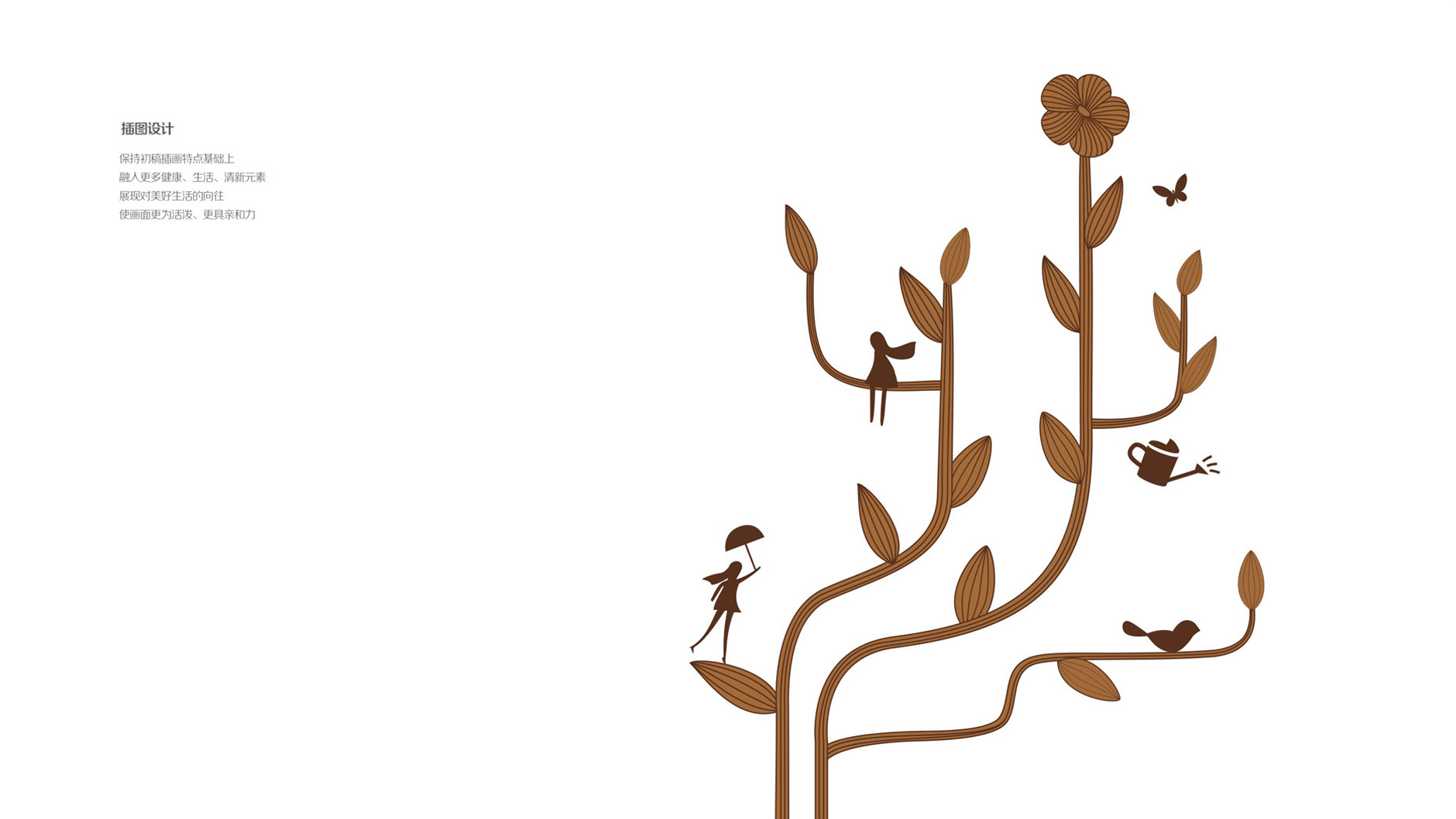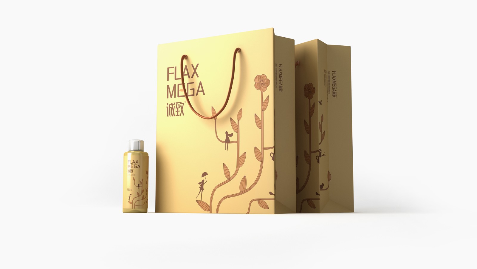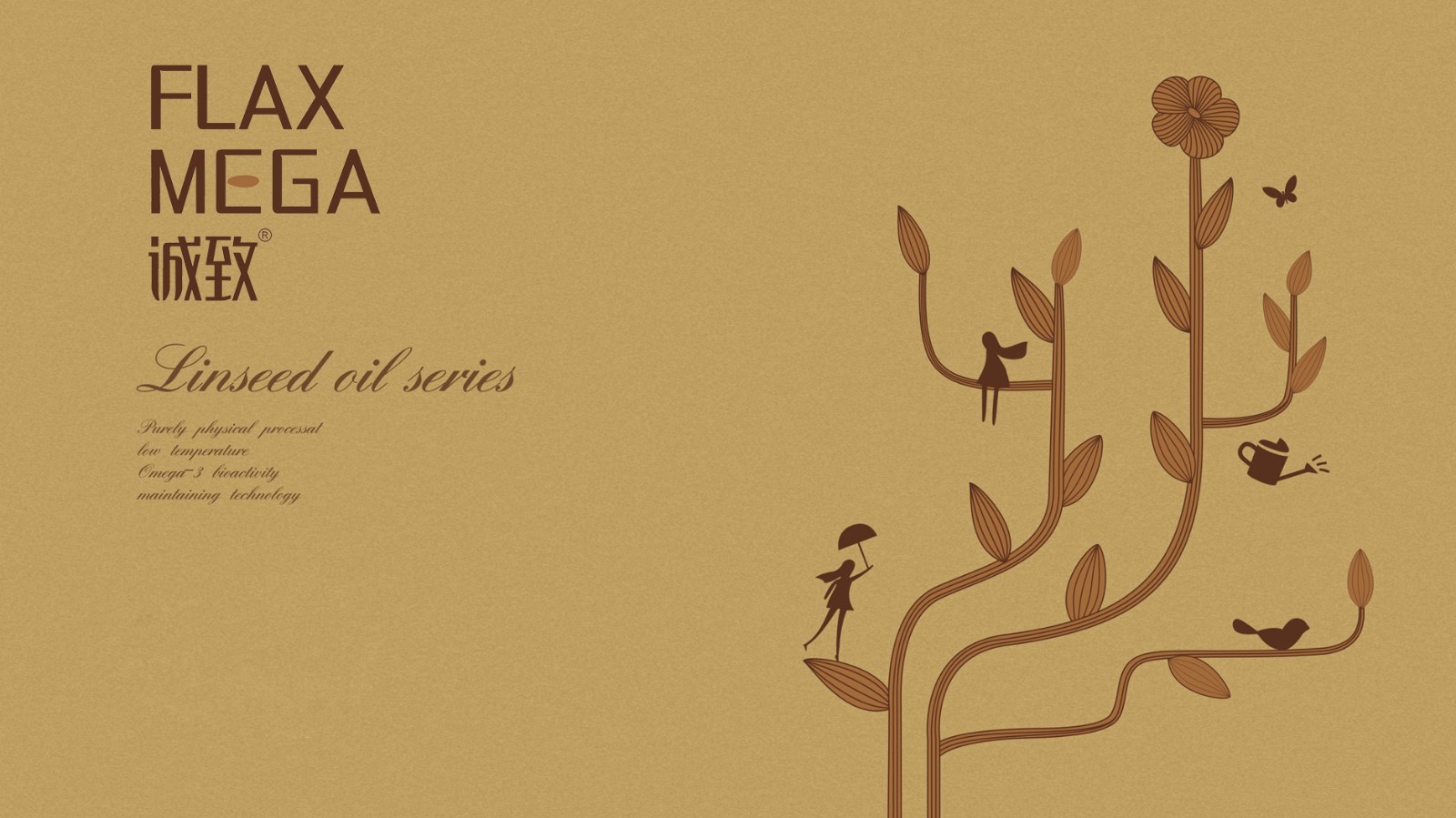 二、創(chuàng)作過程:智圓行方公司采用獨(dú)特的創(chuàng)作手法——手繪亞麻植物插畫,在亞麻植物特征的基礎(chǔ)上,進(jìn)行趣味、夸張。將亞麻植物創(chuàng)作成“大樹”的形態(tài),線條優(yōu)雅、流暢,“大樹”上有枝蔓、葉子、花朵,整體感受有活力、陽光、向上。并融入許多健康、生活、清新元素:撐傘起舞的人物、發(fā)絲飄動(dòng)的人物、棲息的鳥兒、舞動(dòng)的蝴蝶,還有澆灌植物的灑水壺,仿佛感受到了雨露、清風(fēng)與鳥鳴,這是一個(gè)表達(dá)人與動(dòng)物、植物相互協(xié)作共生的美好畫面。展現(xiàn)對人們對美好生活的向往,人物、動(dòng)物的加入使畫面更為活潑、更具親和力?!皻W米伽-3”、“兒童”、“孕婦”的插畫,延續(xù)植物特征,風(fēng)格既對立又統(tǒng)一,是基于不同功能的亞麻膠囊進(jìn)行創(chuàng)作的,直觀的傳達(dá)出產(chǎn)品的功能及受用對象。